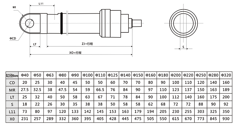 冶金液壓缸尾部單耳環(huán)外形安裝尺寸圖