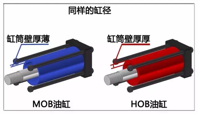 MOB油缸與HOB油缸相比:因承載壓力不同,在相同缸徑條件下,HOB油缸壁厚相對(duì)MOB油缸較厚。