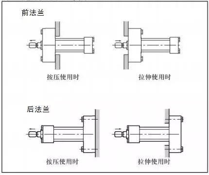 (1)法蘭安裝適合于液壓缸工作過程中固定式安裝,其作用力與支承中心處于同一軸線的工況;其安裝方式選擇位置有端部、中部或尾部三種,如何選擇取決作用于負(fù)載的主要作用力對(duì)活塞桿造成壓縮(推)應(yīng)力、還是拉伸(拉)應(yīng)力,一般壓縮(推)應(yīng)力采用尾部、中部法蘭安裝,拉伸(拉)應(yīng)力采用端部、中部法蘭安裝,確定采用端部、中部或尾部法蘭安裝需同時(shí)結(jié)合系統(tǒng)總體結(jié)構(gòu)設(shè)計(jì)要求和長行程壓縮(推)力工況的液壓缸彎曲穩(wěn)定性確定。